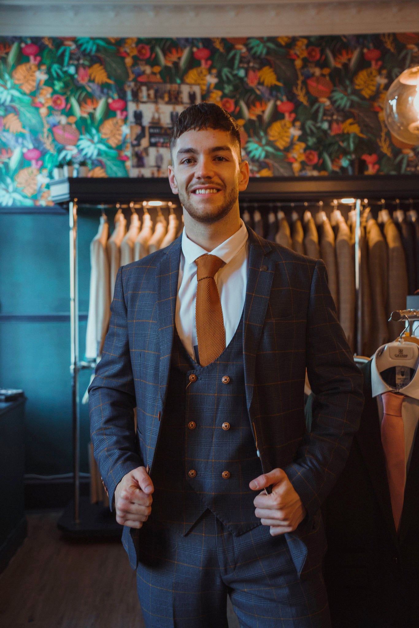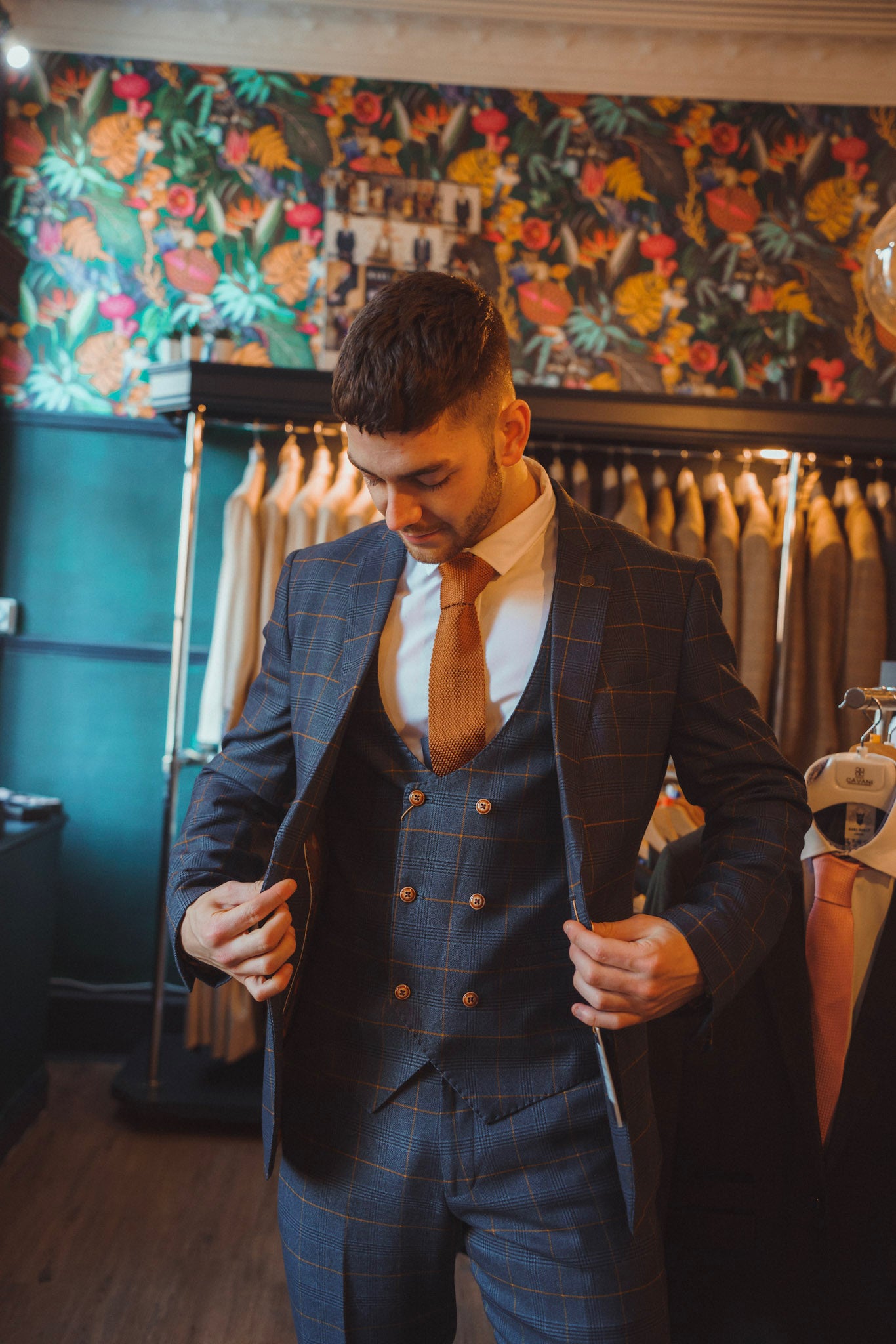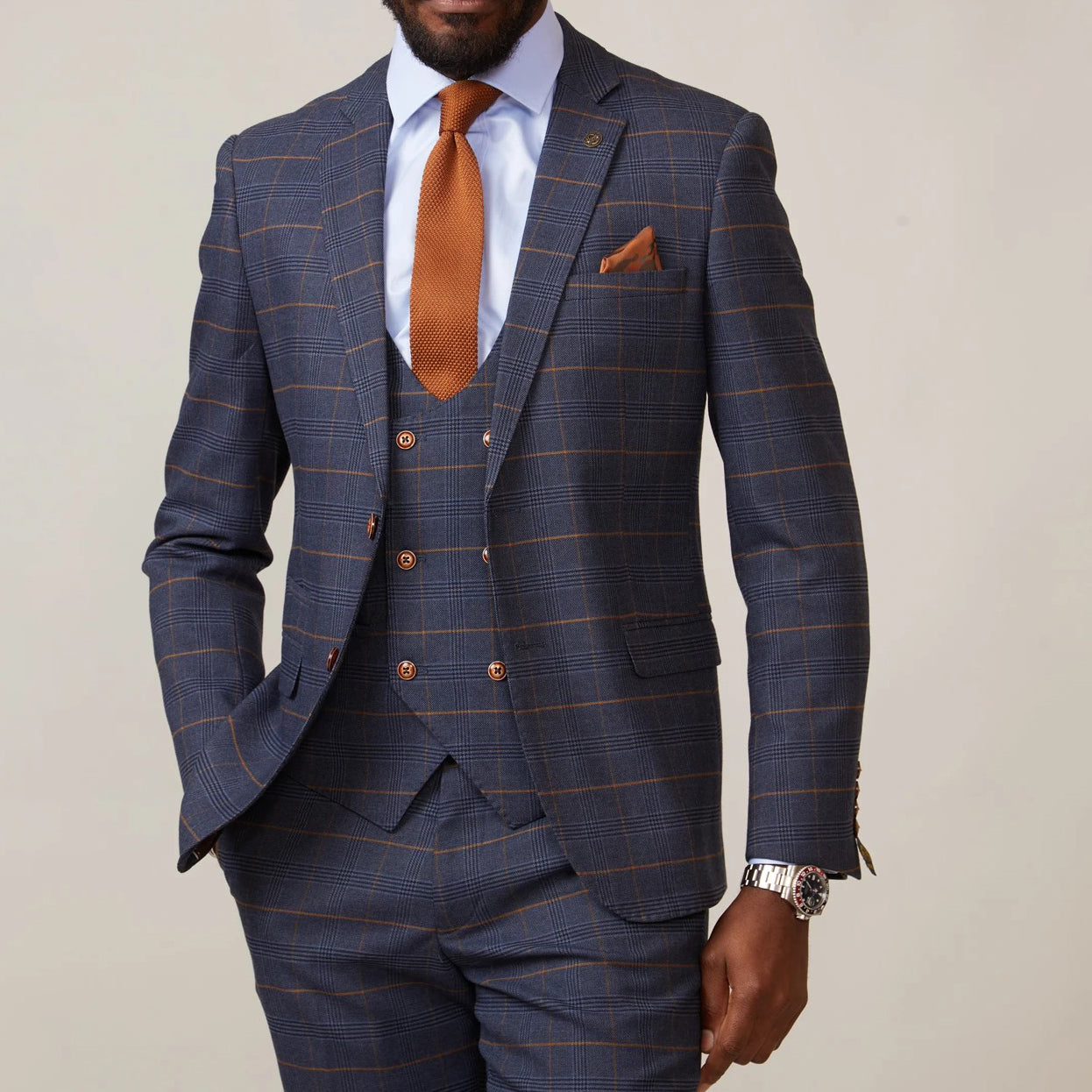 This characterful three-piece suit by Marc Darcy is adorned in a Prince of Wales style check, elevating your workwear. The blazer is dual lined with a modern camouflage print, which also appears on the reverse of the waistcoat, making a statement when the blazer is removed. The rust orange hue complements the marine blue shade and allows easy styling with tan accessories. The suit includes a single-breasted blazer, double-breasted waistcoat, and trousers. Features include a notch lapel, double back vent, four-button cuff, double button blazer fastening, waistcoat adjuster straps, and functional inside and outside pockets in the blazer. Comes with a complimentary pocket square. Available in Newcastle and Hexham stores. Model wears size 38R blazer, 38R waistcoat, and 32R trousers.