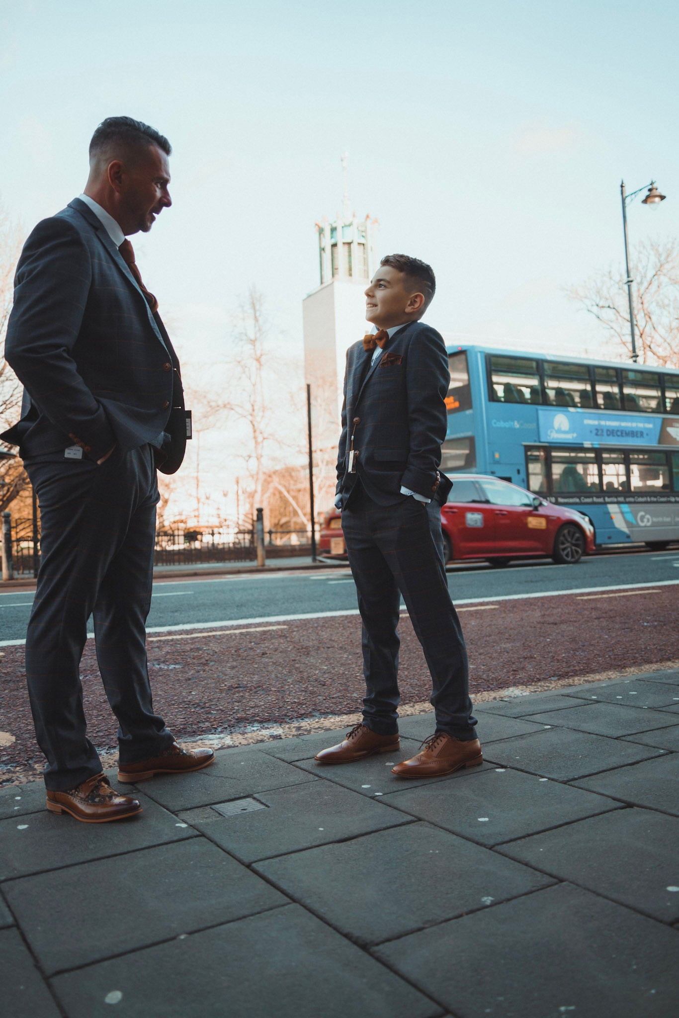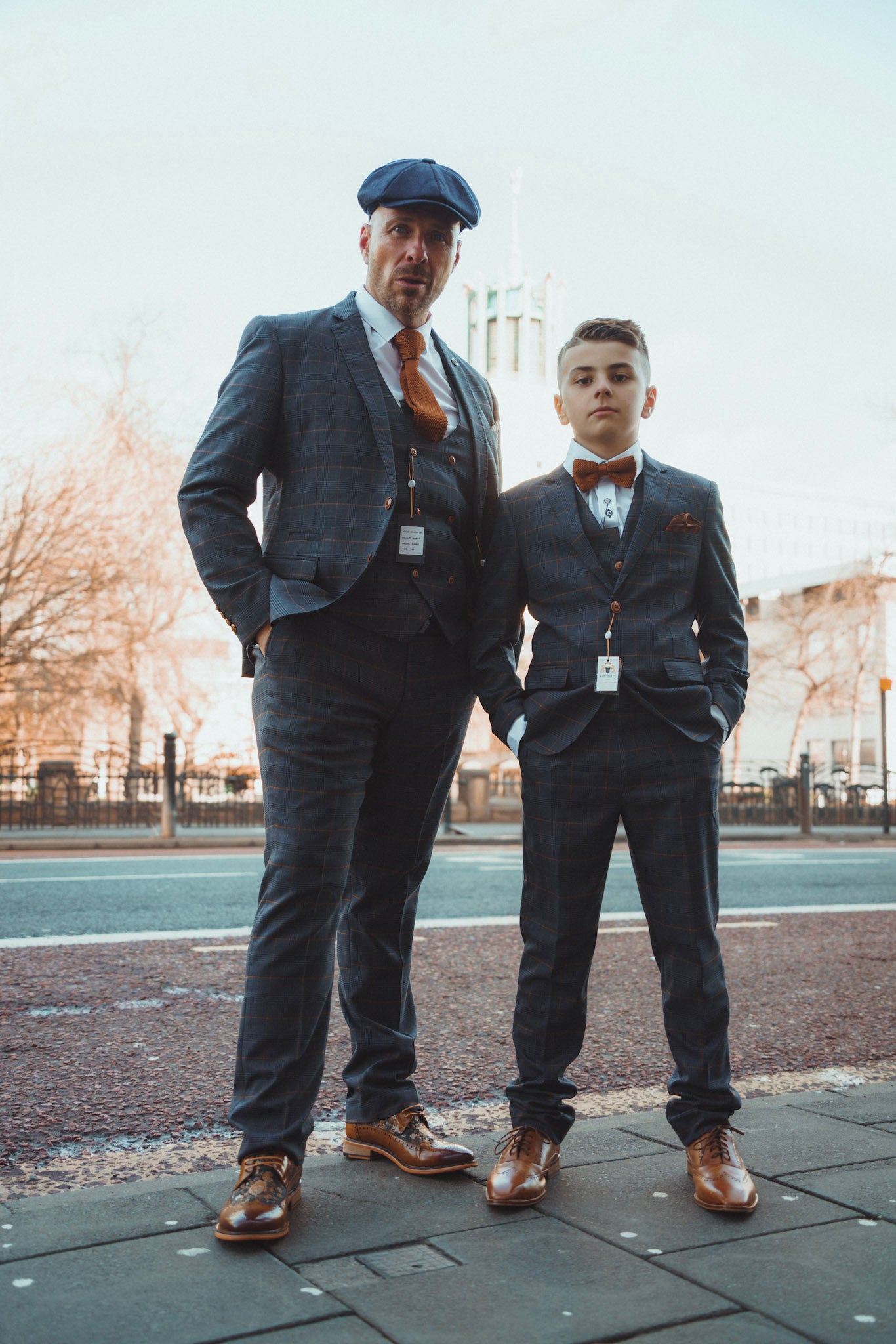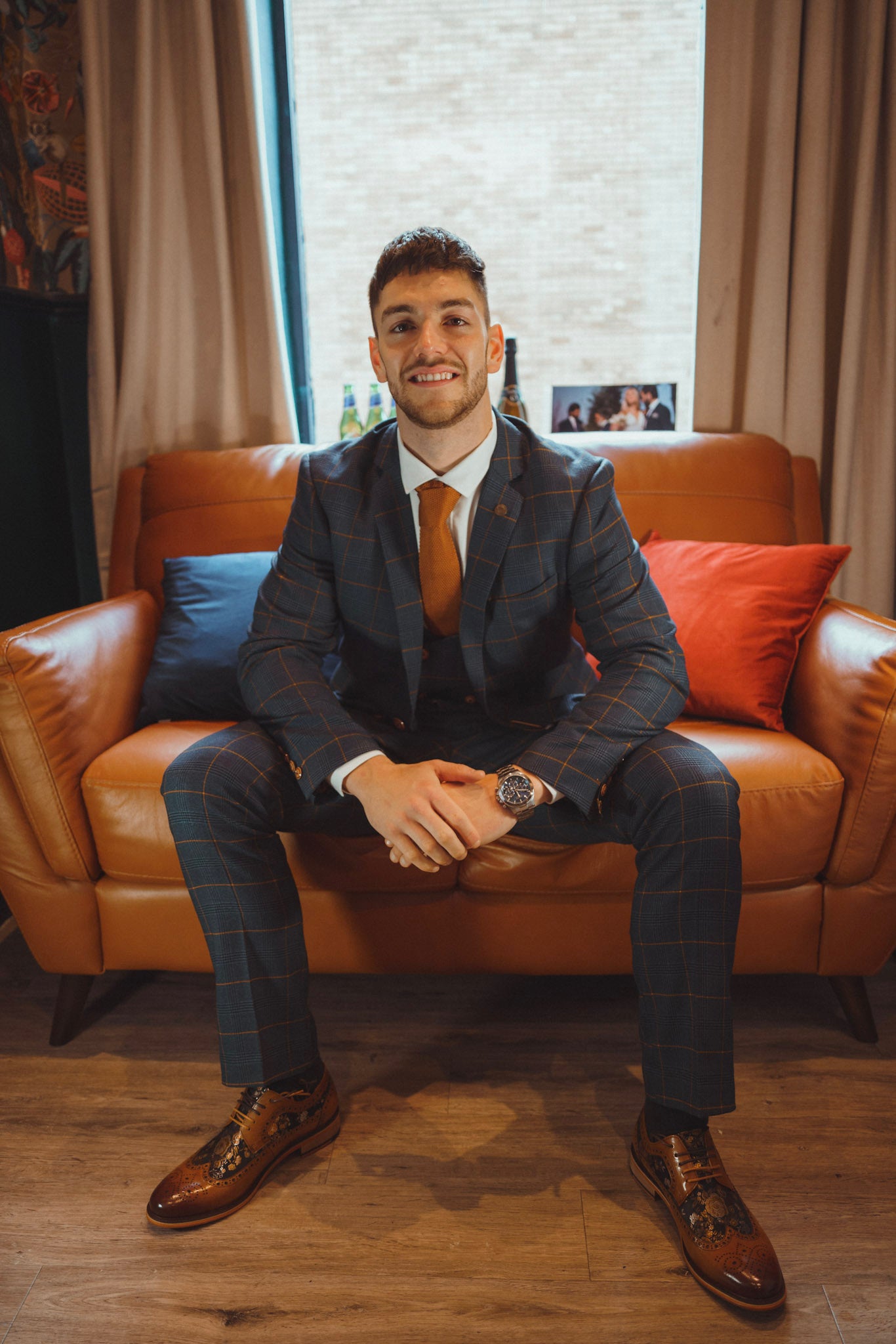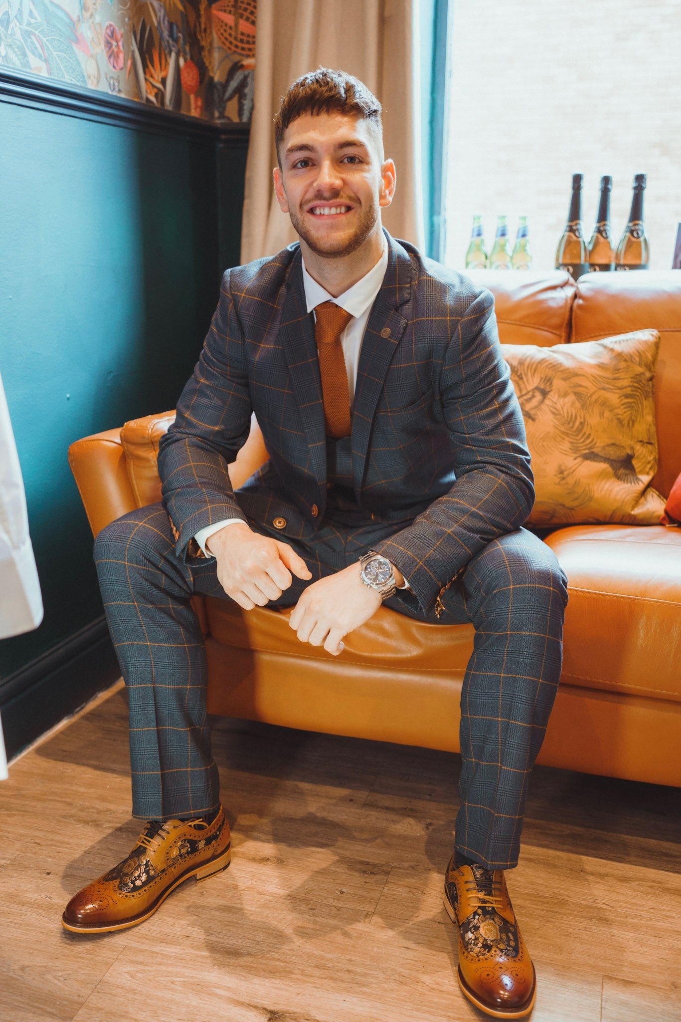 This characterful three-piece suit by Marc Darcy is adorned in a Prince of Wales style check, elevating your workwear. The blazer is dual lined with a modern camouflage print, which also appears on the reverse of the waistcoat, making a statement when the blazer is removed. The rust orange hue complements the marine blue shade and allows easy styling with tan accessories. The suit includes a single-breasted blazer, double-breasted waistcoat, and trousers. Features include a notch lapel, double back vent, four-button cuff, double button blazer fastening, waistcoat adjuster straps, and functional inside and outside pockets in the blazer. Comes with a complimentary pocket square. Available in Newcastle and Hexham stores. Model wears size 38R blazer, 38R waistcoat, and 32R trousers.