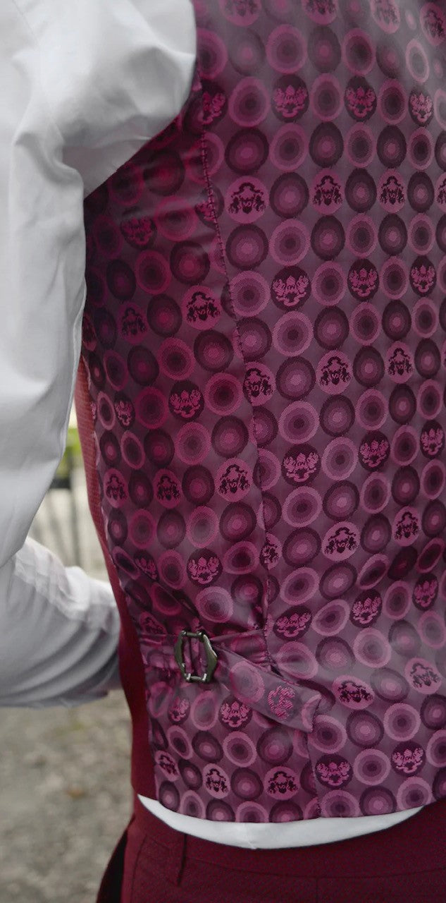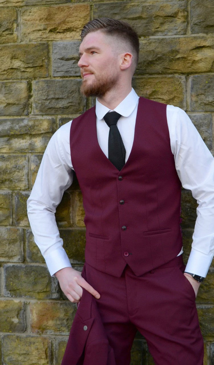 Upgrade your workwear with the Max Wine Waistcoat by Marc Darcy. This sophisticated single-breasted waistcoat offers a distinguished look with its rich wine burgundy color and diamond-textured fabric. It features wine tortoiseshell buttons and comes with a free pocket square, adding an extra touch of elegance to your attire. Ideal for both formal occasions and professional settings, this waistcoat is the perfect blend of class and sophistication.